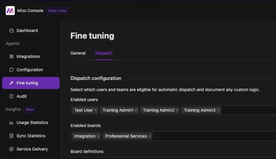Mizo automatically considers technician availability, workload, and skills based on PSA data. In order to enable users and boards for dispatch, please go to the fine-tuning section and enable the desired boards and users.