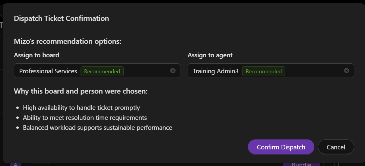 Mizo recommends the best match within the pod when using the Dispatch Ticket action.